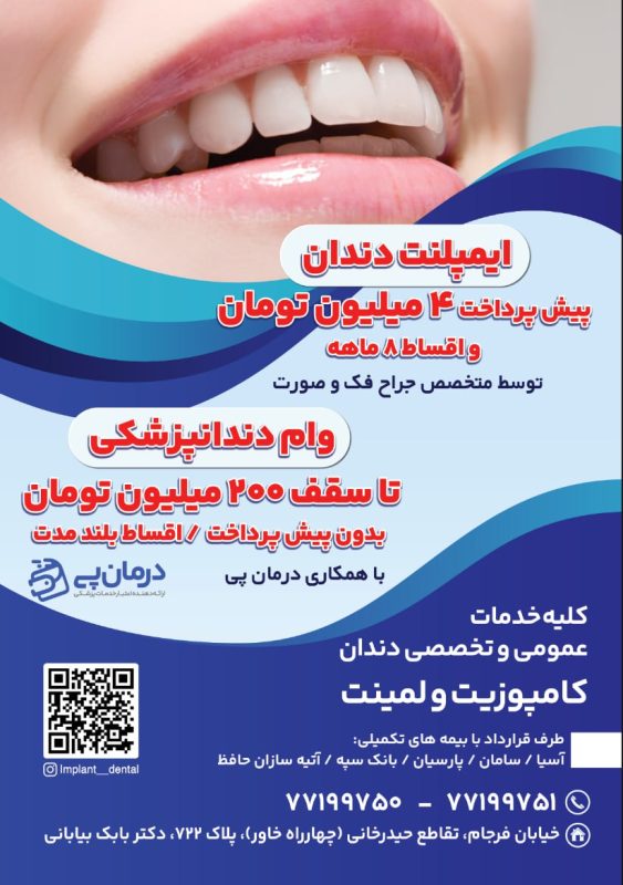 - ایمپلنت دندان با پیش پرداخت 4 میلیون تومان و اقساط 8 ماهه توسط متخصص جراح فک و صورت